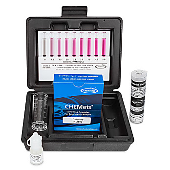 Because of its strong oxidizing properties, chlorine is an excellent biocide used to treat potable waters, municipal wastes, and swimming pools. When used to treat potable water, chlorine helps alleviate the adverse effects of iron, manganese, ammonia, and sulfide. The Maximum Residual Disinfectant Level for chlorine is 4 mg/L in drinking water.The DPD MethodReferences: USEPA Methods for Chemical Analysis of Water and Wastes, Method 330.5 (1983). APHA Standard Methods, 23rd ed Method 4500-Cl G- 2000.In the USEPA-accepted DPD methodology, free chlorine reacts with DPD to form a pink product. When ammonia or amines are present, some of the chlorine may exist as combined chlorine. Combined chlorine will not interfere with the free chlorine results, provided the readings are taken at one minute. To determine total chlorine (the sum of free and combined), use the A-2500 Activator Solution (potassium iodide) supplied in the kit. Results are expressed as ppm (mg/L) Cl2.The DPD method is also applicable to the direct determination of hypochlorite concentrations in various cleaning preparations and disinfectants prior to their dilution. DPD reacts with hypochlorite ions to form a pink color. Results are expressed as percent (%) NaOCl.The DDPD™ MethodReference: Developed by CHEMetricsThe DDPD™ method is derived from the DPD method. Test kits that employ this chemistry are well suited for use where biocides and chromate corrosion inhibitors are used simultaneously. DDPD reacts with free chlorine to form a purple product. When ammonia or amines are present in the sample, some of the chlorine may exist as combined chlorine. To determine total chlorine (the sum of free and combined), use the A-2500 Activator Solution (potassium iodide) that is supplied in the kit. Results are expressed as ppm (mg/L) Cl2.WARNING! This product can expose you to chemicals including formaldehyde, which is known to the State of California to cause cancer, and methanol, which is known to the State of California to cause birth defects or other reproductive harm. For more information go to www.P65Warnings.ca.gov.
