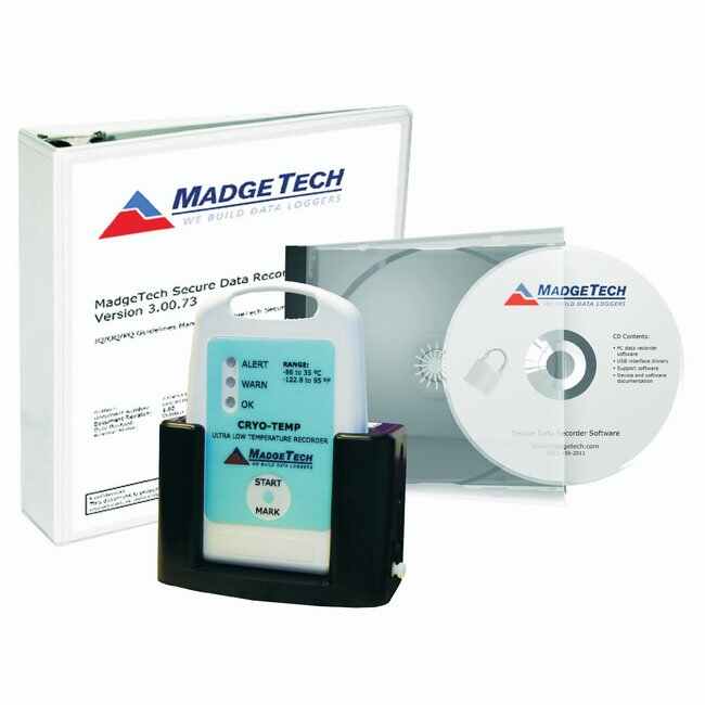 Provides a complete stand-alone temperature mapping and validation solution for freezers of all sizes and configurations. It includes Cryo-Temp dataloggers, a USB docking station with 6 ft. of cable, MadgeTech's Secure FDA 21 CFR Part 11 software and IQ/OQ/PQ validation protocols. It can be fully customized to include user-specified quantities of each item in the system to accommodate specific applications.Splash-resistant unit can measure and record temperatures as low as -86°CTo provide data integrity and meet requirements of FDA 21 CFR Part 11, the secure software includes electronic signatures, access codes, a secure data file and an audit trailFor large freezers, the software can graph datasets from multiple loggers to show variances in different parts of the freezer; this can reveal air stratification, hot spots and anomalies in chilling systemsAvailable with 9 or 15 Cryo-Temp dataloggers or the system can be completely customized to meet the validation needs of a specific freezer IQ/OQ/PQ Validation protocolsTemperature range: -86°C to 35°C Resolution: 0.1°C Accuracy: ±1°C Battery life: One year at -80°C User-programmable temperature alarms with LEDs (OK, warn, and alarm)Hardware and software password protection, memory wrap, user-programmable start times, sample intervals, logger s, unique IDsGeneral Specifications:Memory: 32,767Reading Rate: 5 seconds up to 30 minutesSingle/Multi-Use: Multi-useBattery Life: 2 years typical at 25°C, 1 min. reading intervals; 1 year typical at -80°C, 1 min. reading intervalsMaterial: ABS plasticDimensions: 3.3 x 2.1 x 0.4 in., (8.3 x 5.4 x 1.1cm)Operating Environment: -86 to 35°C (-122.8 to 95°F), 0 to 95% RHRequired Interface Package: USB Docking Station (Cat. No. 15-060-038)Temperature: Temperature Sensor: ThermistorTemperature Range: -86 to 35°C (-122.8 to 95°F)Temperature Resolution: 0.1°C (0.18°F)Temperature Calibrated Accuracy: ±1.0°C (1.8°F)Note: Not compatible with 64 bit operating systems or Windows™ 7.Ultralow freezer validation, Ultralow freezer mapping, Ultralow freezer stabilization studies, Temperature surveys: reveal stratification of air, reveal hot spots, reveal anomalies in chilling systems.CertificationsNIST traceable calibration certificatesComplianceCE approved; FDA 21 CFR Part 11 Compliant.