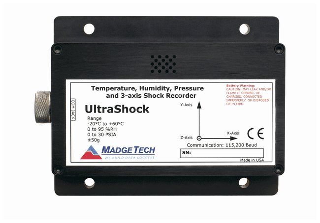 Measures and records data for temperature, pressure and humidity at user selectable reading rates, while shock/acceleration data is sampled at 512Hz and at the user-specified reading rate, writes the peak acceleration (g force) to memory.Battery powered, stand alone data loggerCompact, portable, easy to use device measures and records data for up to 174,762 measurements per channelStorage medium is nonvolatile solid-state memory, providing maximum data security even if battery becomes dischargedDevice can be started and stopped directly from your computer and its small size allows it to fit almost anywhereUltraShock makes data retrieval quick and easy; simply plug into USB port and user-friendly software does the restAvailable in four ranges: ±5g, ±50g, ±100g and ±250gSpecificationsMemory: 174,762/channelReading Rate (Shock): 64Hz up to 5 minutesReading Rate (Temp, Pressure, Humidity): Approx. every 2 sec. for intervals shorter than 2 sec.Baud Rate: 115,200 bpsBattery Life: 7 days typicalMaterial: Anodized aluminumDimensions: 3.5 x 4.4 x 1.1 in. (8.9 x 11.2 x 2.8cm)Operating Environment: -20∽ 60°C, 0∽95%RH noncondensingRequired Interface Package: IFC200 (Cat. No. 15-060-036) Specifically designed for documenting dynamic environments such as moving vehicles, trucks, containers, ships, etc. Also valuable in characterizing environments such as production and assembly lines of delicate electronics, IC fabrication, communications and computer components.