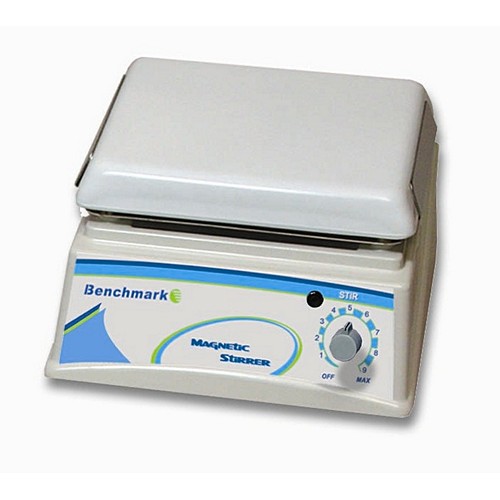 Benchmark Magnetic Stirrer Benchmark magnetic stirrers feature an exceptionally durable, chemical resistant white ceramic work surface. Their space-efficient design (8 X 9 in. footprint), makes them ideal for use on crowded bench tops and inside of bio-hoods. Advanced microprocessor control with convenient turn knob allow quick, precise adjustment and maintenance of speed. Safety indicator LED on the front panel indicate when stirring function has been activated. With a square 7.5 in work surface it is compatible with a wide variety of popular sizes of borosilicate glass beakers, flasks, bottles and other vessels.