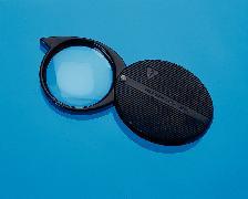 Folding Pocket Magnifier^ Single 37mm lens with 4x power. Diopters: 16. Swing-away plastic case serves as handle and protective case.