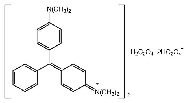 Biological stain, dye reagent, acid base indicator: pH 0.0 yellow, 2.0 green;11.6 green, 14 colorlessMalachite Green oxalate is used as the staining solution for embedded botanical material and as a spore stain. It is also used in studying the photocatalytic degradation with TiO2/WO3. It is employed for determining phosphate in serum and as a reference material in analytical chemistry for the quantification. It is also used as a pH indicator between pH 0.2 - 1.8. It is used as a dye for materials such as silk, leather, and paper.