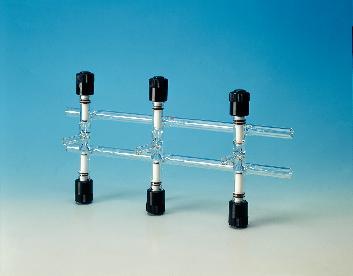 AIRLESS-WARE* Manifold^ Each stopcock has a metering groove cut into the plug to provide fine control of vacuum sources and inert gases. Distance between the three stopcocks is 65mm. Approximate overall length: 230mm. Number 2 hose connectors.