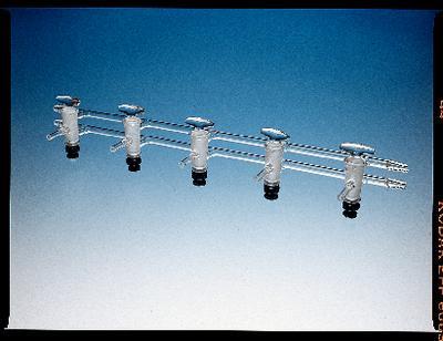 AIRLESS-WARE* Manifold^ Each stopcock has a metering groove cut into the plug to provide fine control of vacuum sources and inert gases. Distance between the five stopcocks is 100mm. Approximate overall length: 500mm. Number 2 hose connectors.