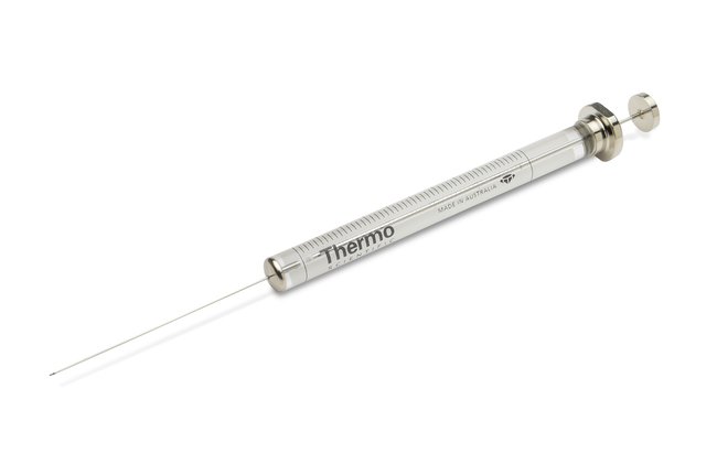 Get durability, clarity and accuracy from Thermo Scientific™ Manual Fixed Needle, Gas Tight Syringes. Used for manual sample injection into gas chromatography (GC) instrument, they provide accuracy and reproducibility that gives you confidence in analytical results, time-after-time. These syringes have an affixed needle and a plunger that creates a tight seal with the barrel. Choose from a variety of sizes and types. They are available in standard industry size with black easy-to-read and solvent-resistant markings.Durability The enhanced design of the syringes delivers: Improved solvent resistance Greater temperature range Increased operational smoothness Longer lifetime and improved cycle life Clarity Syringes are provided with a clear, easy-to-read black scale, which aids in consistent delivery of samples for manual syringes and easy identification of installed autosampler syringes. Accuracy The enhanced design of the syringe has eliminated areas where the sample can become trapped and potentially cause carryover: Closer fit between the plunger tip and PTFE insert at the zero position Tighter fit between PTFE insert and glass barrel Improved fixed needle attachment In addition, the reduction in adhesive from the fluid path enhances durability and reduces the risk of sample interaction with the adhesive.