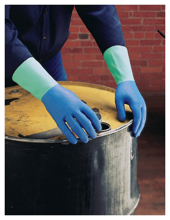 Green latex gloves with blue nitrile blend over-dip adds resistance to cuts, punctures and abrasions.