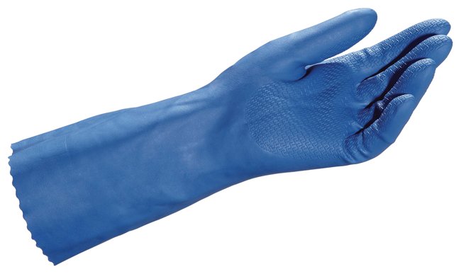 Polychloroprene chemical resistant gloves are flexible and feature embossed texture for better grip on wet objects.