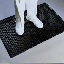 Softline* Rubber Mat^ Non-slip 15.8mm thick rubber mat combats cumulative trauma disorders associated with standing work positions. Chemically resistant non-porous mat withstands grease, organic solvents, gasoline, and oil. May be used in Class 100 cleanrooms. Autoclavable. Color: Black. 61x91cm.