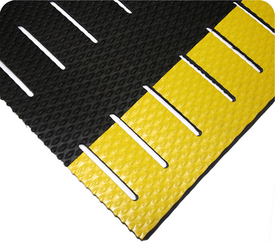 #475 Kushion Walk, 3/8 inch x 2 x 60 Unslotted, Black/Yellow^ Anti-fatigue mat. Tough, abrasion resistant runner. Textured surface guards against slip and fall injuries, knobbed bottom permits aeration. Ideal for grates and catwalks.