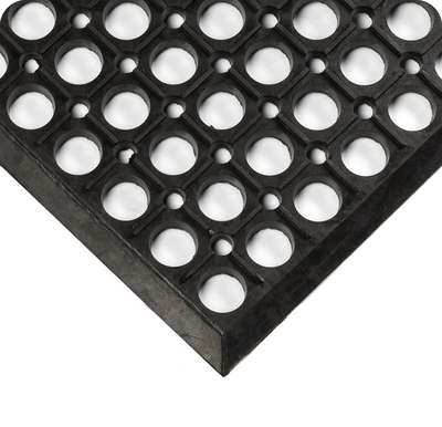 #474 WorkRite 1/2 inch x 3 x 20 Black^ Anti-fatigue mat. Natural rubber and flow-through design create an extremely popular all-purpose mat. An economical choice for comfort and safety. Accommodates spills and debris keeping employees safe and dry. Lightweight with a molded beveled edging for cart access.