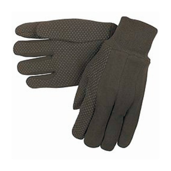 A clute pattern, mini-dotted brown jersey glove made of a cotton polyester blend. This glove features mini dots on the palm, thumb, and forefinger for grip, wear, and abrasion resistance.