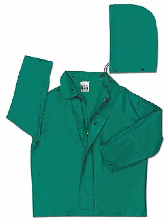 Jacket with removable drawstring hood, take up snaps at wristsPVC/Hi-tensil polyester/PVCZipper front with double storm flap, no pockets or ventsInner sleeves to prevent splash backLimited FlammabilityNOT intended for use as protection against ARC Flash or Flash Fire