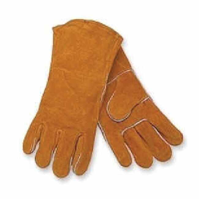 A russett color, economy shoulder split leather glove that features a 13 inch one piece back, is fully lined, and welted.