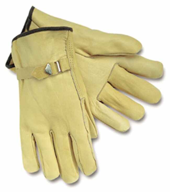 Gloves are constructed from unlined premium grade grain cowhide leather with a pull strap back, rolled leather hems, and a straight thumb pattern.