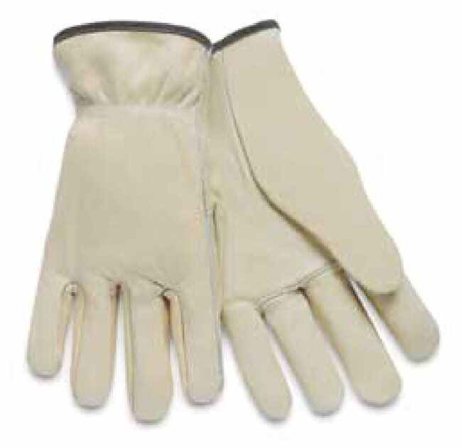 Gloves are constructed from unlined select grade cowhide leather with a shirred elastic back, cotton hem, and a straight thumb pattern.