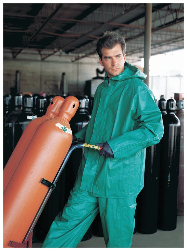 Made of tough scrim material double-coated with two thick layers of PVC for a combined thickness of 0.42 mmLimited flammabilityRoomy constructionQuick-release suspendersSuits offer great protection against many chemicals and acidsTwo pieces: Jacket with attached hood and inner sleeve plus bib pantsColor: Gree
