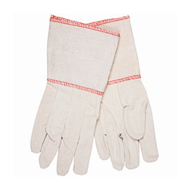 Constructed from medium weight, 10 oz. natural cotton canvas. Gloves feature a clute pattern, straight thumb, and a 4.5 inch plasticized gauntlet cuff.
