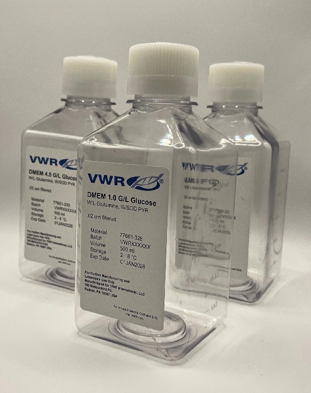 VWR® DMEM high glucose liquid media supports cell growth in research, upstream process development, and cell culture manufacturing processes., DMEM media contain increased concentrations of vitamins, minerals, and amino acids compared to traditional basal media. DMEM medium composition also includes ferric nitrate, making this cell culture medium an option for certain cell lines requiring iron for cell growth. DMEM media preparations are available in high or low glucose formulations, as well as with or without L-glutamine, magnesium, and sodium pyruvate. DMEM formulation options may also include phenol red as a pH indicator. All available DMEM media products contain a sodium bicarbonate buffer with or without HEPES to maintain optimal culture pH., 04_BodyText: VWR® DMEM raw material components are screened through strict quality control testing for lot-to-lot consistency. DMEM liquid media products are hydrated using purified water and undergo sterile filtration., 05_BodyText: DMEM is used for a variety of mammalian cell culture manufacturing processes and research applications. DMEM media formulations have supported tumorigenicity studies, virus replication analyses, and investigations into the influence of cell culture media on gene expression. DMEM medium is commonly used for adherent cells and has been the cell culture medium of choice for hybridoma, fibroblast, neuron, and smooth muscle cell lines as well as many other tissues types. DMEM medium is frequently combined with fetal bovine serum (FBS) as DMEM media composition does not include the growth factors, proteins, hormones, or lipids needed to promote cell growth., 02_BulletPoint: Manufactured in cGMP (21 CFR 820) compliant and ISO9001 certified facilities, DMEM/high: With 4500 mg/L glucose, 4.0 mM L-Glutamine, and 110 mg/L sodium pyruvate, Size: 500 ml, Storage Temperature: 2...8 °C, Cat. No.: 77661-366, VWR® DMEM high glucose liquid media supports cell growth in research, upstream process development, and cell culture manufacturing processes., DMEM media contain increased concentrations of vitamins, minerals, and amino acids compared to traditional basal media. DMEM medium composition also includes ferric nitrate, making this cell culture medium an option for certain cell lines requiring iron for cell growth. DMEM media preparations are available in high or low glucose formulations, as well as with or without L-glutamine, magnesium, and sodium pyruvate. DMEM formulation options may also include phenol red as a pH indicator. All available DMEM media products contain a sodium bicarbonate buffer with or without HEPES to maintain optimal culture pH., 04_BodyText: VWR® DMEM raw material components are screened through strict quality control testing for lot-to-lot consistency. DMEM liquid media products are hydrated using purified water and undergo sterile filtration., 05_BodyText: DMEM is used for a variety of mammalian cell culture manufacturing processes and research applications. DMEM media formulations have supported tumorigenicity studies, virus replication analyses, and investigations into the influence of cell culture media on gene expression. DMEM medium is commonly used for adherent cells and has been the cell culture medium of choice for hybridoma, fibroblast, neuron, and smooth muscle cell lines as well as many other tissues types. DMEM medium is frequently combined with fetal bovine serum (FBS) as DMEM media composition does not include the growth factors, proteins, hormones, or lipids needed to promote cell growth., 02_BulletPoint: Manufactured in cGMP (21 CFR 820) compliant and ISO9001 certified facilities, DMEM/high: With 4,500 mg/L glucose, with 4.0 mM L-Glutamine and 110 mg/L sodium pyruvate, Size: 500 ml, Sodium pyruvate: No, L-Glutamine: No, Storage Temperature: 2...8 °C, Cat. No.: 77661-364, VWR® DMEM high glucose liquid media supports cell growth in research, upstream process development, and cell culture manufacturing processes., DMEM media contain increased concentrations of vitamins, minerals, and amino acids compared to traditional basal media. DMEM medium composition also includes ferric nitrate, making this cell culture medium an option for certain cell lines requiring iron for cell growth. DMEM media preparations are available in high or low glucose formulations, as well as with or without L-glutamine, magnesium, and sodium pyruvate. DMEM formulation options may also include phenol red as a pH indicator. All available DMEM media products contain a sodium bicarbonate buffer with or without HEPES to maintain optimal culture pH., 04_BodyText: VWR® DMEM raw material components are screened through strict quality control testing for lot-to-lot consistency. DMEM liquid media products are hydrated using purified water and undergo sterile filtration., 05_BodyText: DMEM is used for a variety of mammalian cell culture manufacturing processes and research applications. DMEM media formulations have supported tumorigenicity studies, virus replication analyses, and investigations into the influence of cell culture media on gene expression. DMEM medium is commonly used for adherent cells and has been the cell culture medium of choice for hybridoma, fibroblast, neuron, and smooth muscle cell lines as well as many other tissues types. DMEM medium is frequently combined with fetal bovine serum (FBS) as DMEM media composition does not include the growth factors, proteins, hormones, or lipids needed to promote cell growth., 02_BulletPoint: Manufactured in cGMP (21 CFR 820) compliant and ISO9001 certified facilities, Without L-Glutamine, with sodium pyruvate, Size: 500 ml, Sodium pyruvate: Yes, L-Glutamine: No, Storage Temperature: 2...8 °C, Cat. No.: 77661-374, VWR® DMEM high glucose liquid media supports cell growth in research, upstream process development, and cell culture manufacturing processes., DMEM media contain increased concentrations of vitamins, minerals, and amino acids compared to traditional basal 