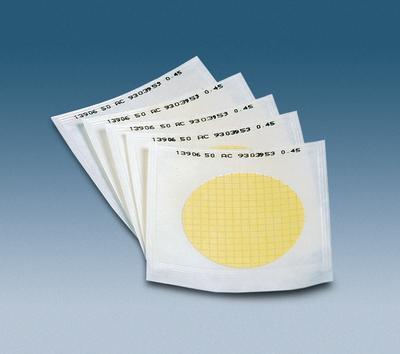 Membrane Filter^ ReliaDisc* Gridded Sterile Microbiological membrane, Cellulose Nitrate, packed individually for use in colony counting and particle testing. Black membrane with a white grid. Low-protein binding hydrophilic membrane. 47mm diameter. 0.45 micron pore size.