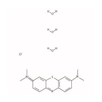 Specifications A non-intercalating stain for DNA.A useful inhibitor of cGMP-mediated processes and a useful stainUsed after electrophoresisLess sensitive than Ethidium Bromide.Reagent GradeSynonym: C.I. Basic Blue 9, trihydrate (8CI); Methylthionine chlorideChloride, TrihydrateEM (661nm, water) >69,000Ash <1.0%Moisture <15.0%Zinc <0.001%Copper <0.01%Lead <0.001%Appearance: SolidMelting Point: 190°C (dec.) (tautomer)RTECS Number: SP5740000Molecular Weight373.9 g/molMolecular FormulaC16H18ClN3S•3H2OCAS7220-79-3StorageRTSolubilitySoluble in water (50 mg/ml), ethanol (70 mg/ml), alcohol, and chloroform. Insoluble in ether.Brand NamebioPLUSSize100 g