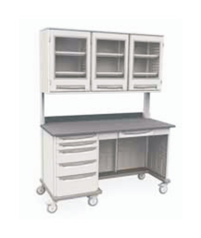 Allow fast and easy installation and reconfiguration of lab furniture and workspaces; polymer enclosures and rigid aluminum and metal substructure provide a robust work environment that is durable, lasting and easy to clean.Triple-wide, nonlocking drawers with 88.9cm (35 in.) right-side kneehole, pencil drawer and 12.7cm (5 in.) diameter polymer casters (3 toe brakes, 2 swivel brakes)Microban™ antimicrobial product protection inhibits growth of mold, mildew and bacteria2.5cm (1 in.) thick black epoxy countertop with 7.6cm (3 in.) backsplashDrawer material: polymerTop material: epoxy resinTwo 7.6cm (3 in.), two 15.2cm (6 in.), and one 22.9cm (9 in.) polymer drawers with taupe drawer pulls68.6cm (27 in.) interior triple-wide overhead cabinet with two single-wide, two double-wide polymer shelves and 225° clear locking doorsOverall Dimensions (D × W × H): 2.7 × 160.6 × 207cm (28.6 × 63.2 × 81.5 in.)Countertop to overhead clearance: 40.6cm (16 in.)Countertop height: 92.7cm (36.5 in.)This product(s) resides on a Fisher Scientific GSA or VA contract. If you are viewing this page as a nonregistered user, the price(s) displayed is List Price. To view your GSA or VA contract pricing, log in using your account number, or become a registered user by contacting one of our Customer Service teams. You can also view your contract price by searching for this item(s) on GSA Advantage. To place an order, contact Fisher Scientific Customer Service.