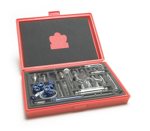 Kits are packed in a rugged polyethylene storage case (2 1/2” H x 13 1/2” W x 10” D) with a die-cut foam insert, High temperature-resistant blue nylon connectors, Ideal for use to 200 °C, Glassware is manufactured from 33 expansion, low extractable borosilicate glass conforming to USP Type I and ASTM E438, Type I, Class A requirements