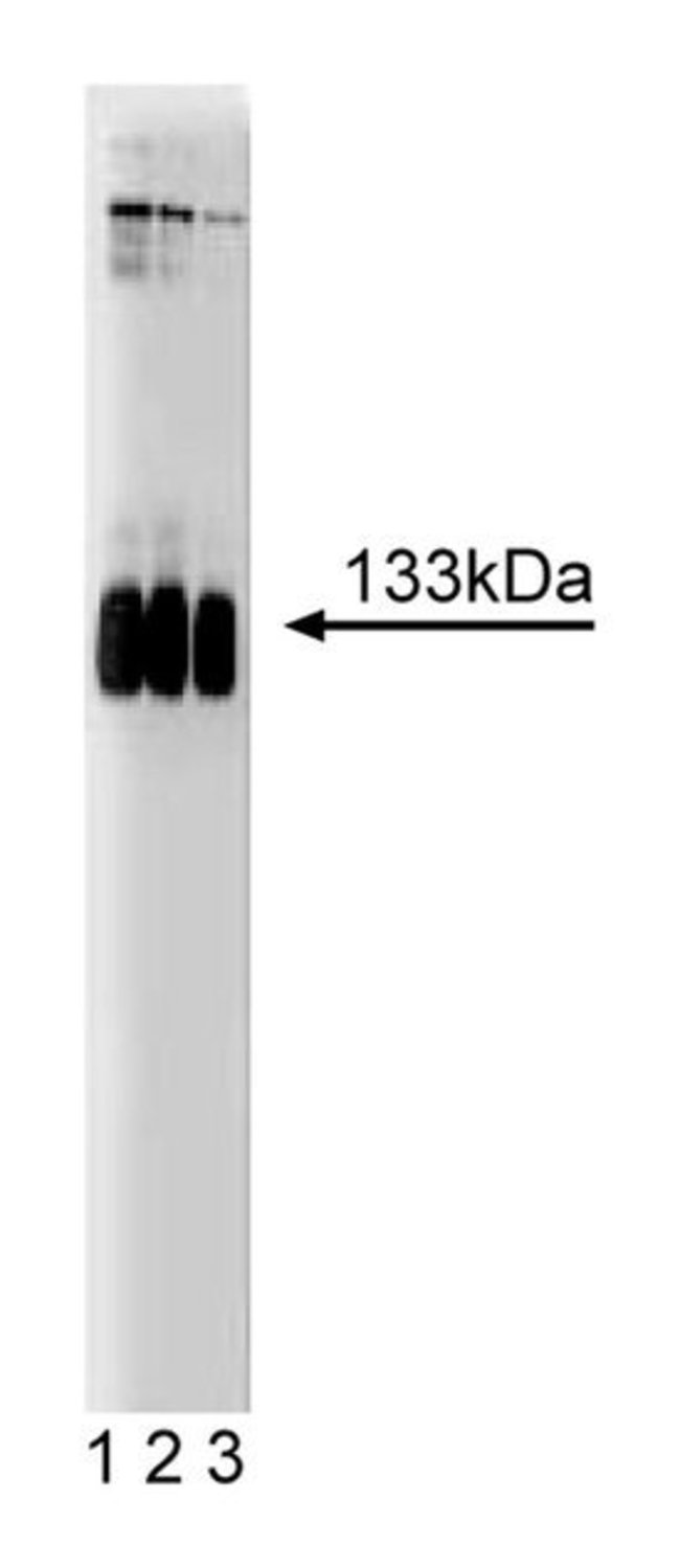 Glutamate is a major excitatory neurotransmitter and functions in multiple roles in the CNS. The functional diversity of glutamate is exemplified by two distinct groups of glutamate receptors: ionotropic and metabotropic. Coupling with G proteins provides the metabotropic glutamate receptors (mGluRs) with the capacity for intracellular signal transduction. Eight metabotropic glutamate receptors (mGluR1-8) and several Ca2+ sensing receptors belong to a novel G-protein coupled receptor (GPCR) family. The mGluRs possess the seven putative transmembrane domains which are characteristic of GPCR proteins. However, they exhibit no additional sequence homology to any member of other GPCR families. mGluR1 has large hydrophilic sequences in both the N- and C-terminal sides of the seven transmembrane domains. The sizable extracellular N-terminal domain is homologous to bacterial periplasmic binding proteins and serves as the glutamate binding site. mGluR1 activates phospholipase C (PLC), resulting in phosphoinositide turnover and, in turn, Ca2+; mobilization necessary for many signal transduction events.Immunofluorescence, Western Blotting