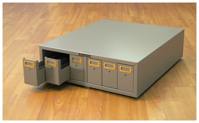 Each drawer divided lengthwise into two compartments for maximum space utilizationEach cabinet holds up to 4500 3 × 1 in. or 75 × 25mm slidesWhen stacked 12 cabinets high (with optional base), up to 54,000 slides can be stored in 2 sq. ft. of floor spaceInterlocking design works with all current Fisherbrand and Fisher Scientific™ metal microslide cabinetsUnit contains six interchangeable drawers, each fitted with cardholder, choice of brass or plastic pull knob, and two compressor blocks to maintain slides upright in partially filled drawersAvailable in dark beige, tan, green, or white. Optional bases available with or without legs. L × W × H: 18.75 × 15.75 × 4.75 in. (47.6 × 40 × 12.1cm)Bases with or without legs available. (See Cat. No. 07-212-104)
