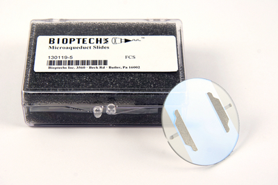 Microaqueduct slide^ Microaqueduct slide, A 40mm diameter, 1mm thick glass circle with an ITO coating on the outer surface, having two port holes and micro aqueduct grooves in it to facilitate laminar flow perfusion in a Bioptechs FCS2 or FCS3 chamber.