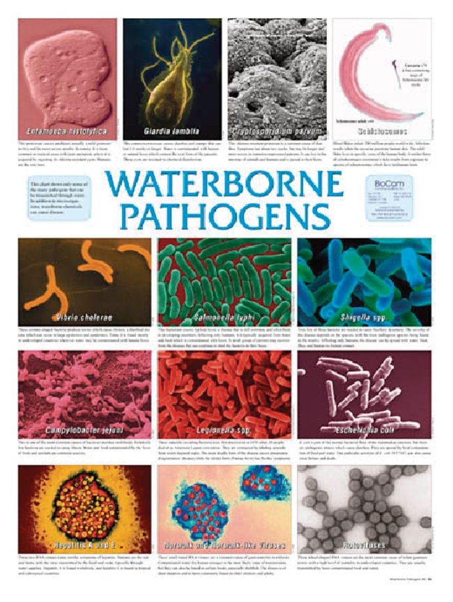 Beautifully illustrated wall charts introduce students to the microscopic world of waterborne pathogens and pathogens that cause microbial food poisoning. Short s highlight the disease symptoms and occurrence and transmission of the pathogens. Charts are laminated for durability.Order InfoDimensions: 18 × 24 in. (45.7 × 70cm)