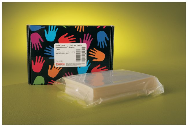Clear, self-sticking sealing tape for standard microplates.Thermo Scientific Microplate Sealing Tape is a package of pre-cut, pressure-sensitive sheets for sealing the surface of standard 96-well or 384-well microplates during incubation steps.Use the disposable sheets to seal and reseal a microplate two or three times for incubation steps in an ELISA or protein assay procedure. Seal plates quickly and easily to allow mixing or prevent evaporation during assay incubation steps.Highlights:Pressure-sensitive – position the tape over plate and press to seal; easy to remove, tooSeparate sheets – each sheet of tape is supplied on its own easy-to-peal backing (liner)Durable and inert – clear acetate film is thick (4.5mil) with a thin layer of acrylic adhesive (1.5mil)