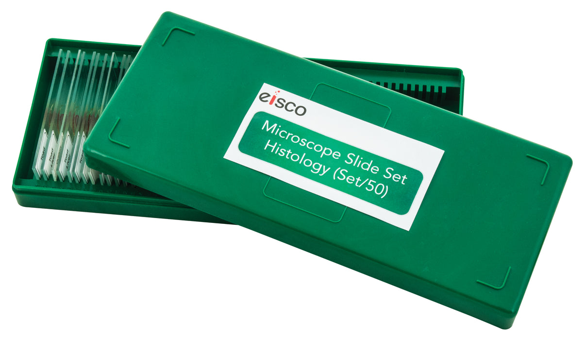 This comprehensive collection of 50 slides covers major animal histology topics. It includes the 25 slides from our standard set, plus additional slides featuring: Kidney, injected, thick section; Squamous epithelium, isolated cells from mouth; Lymphatic, transverse section (TS); Ciliated epithelium; Spleen, TS; Transitional epithelium, bladder wall; Salivary gland, parotid, TS; Adrenal gland, TS; Tendon, teased; Pituitary gland, TS; Hyaline cartilage; Thyroid gland, TS; Elastic connective tissue, vertical section (VS) of pinna; Tongue, VS, for taste buds; Elastic tissue stain; Stomach wall, cardiac end, VS; Articulation, VS joint; Stomach wall, pyloric end, VS; Sciatic nerve, longitudinal section (LS); Colon, TS showing tubular glands; Medulla oblongata, VS; Ureter, TS; Cerebrum, VS; Spermatoza, smear; Heart, LS, entire organ; and Cochlea, guinea pig, VS. Supplied in a box.