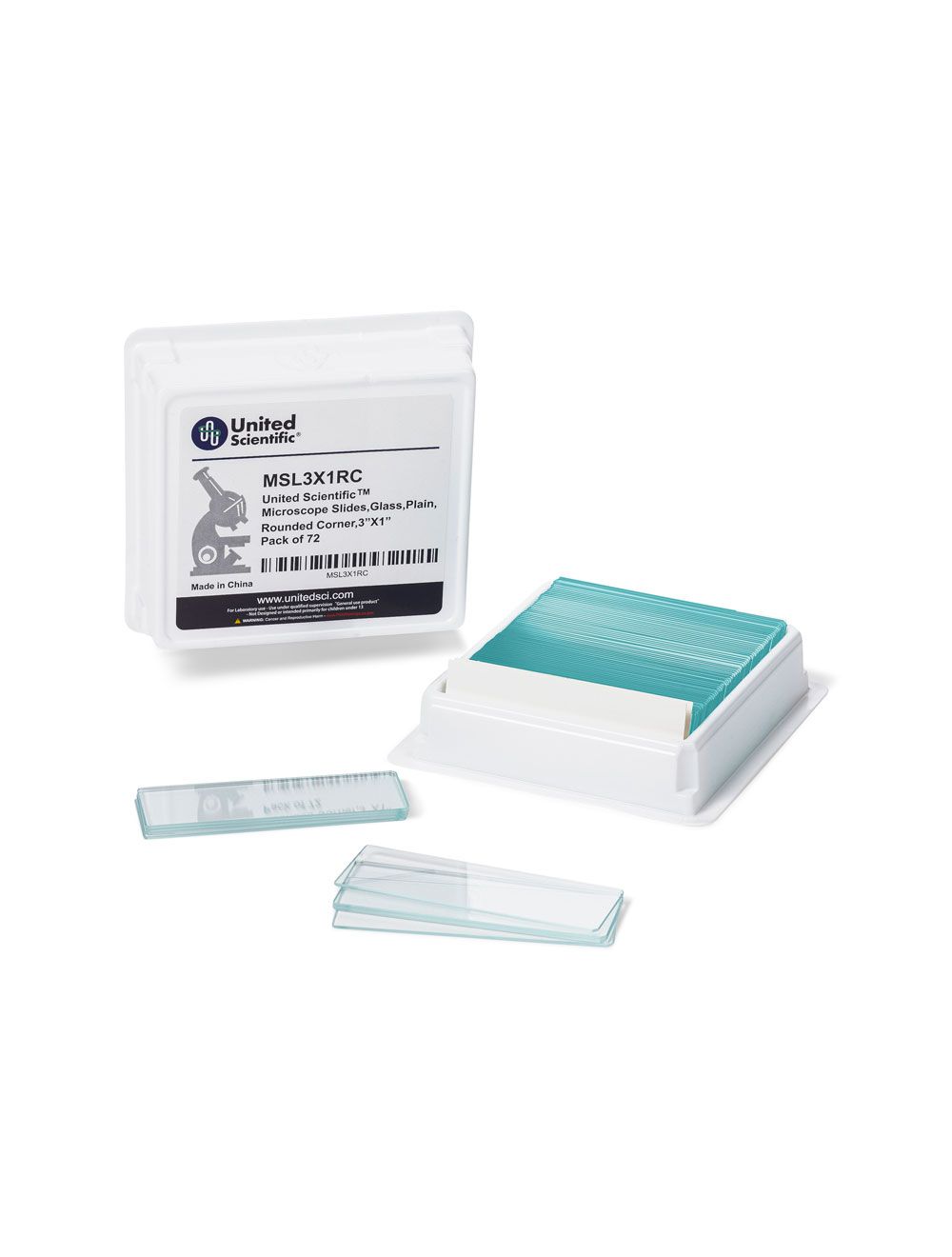 Pre-cleaned slides with rounded corners are 75mm x 25mm, 1.0mm to 1.2mm thick, and are packaged in boxes of 72. Made of quality sheet glass, with ground edges.