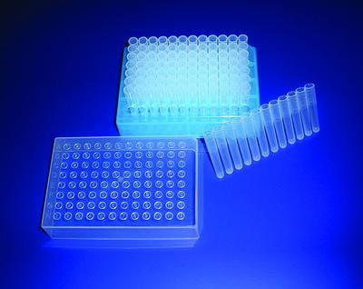 Natural MicroTube* Mat^ Polyethylene. 96 plugs. Ideal for large volume procedures involving direct sample transfer from microtiter plates to racked storage tubes.