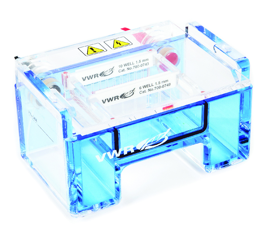 Smallest of the VWR® electrophoresis systems, the MINI S can be used for up to 24 samples enabling short and rapid sample separations., MINI S, MINI M, MINI L and MINI LR electrophoresis systems offer the convenience of direct gel casting in the chamber without the need for external casters. All VWR® horizontal Mini gel systems include a UV-transmissible gel tray, which has a minimum of two comb positions, allowing the user to run from 2 - 12 (depending on the size of the unit) sets of samples for equal distances simultaneously and a fluorescent ruler (silk-screened onto the tray) that aids in the precise photo documentation of each gel run. In total VWR offers four different Mini gel systems which include the MINI LR that is equipped with an internal buffer circulation system., 04_BodyText: A comprehensive range of accessories are available for this range. These include stand-alone casting chambers for pouring up to three gels while the chamber is in use. The casting chambers also provide for quick gel casting outside the chamber if the user wishes to re-use the buffer for more than one gel run. There is also an adjustable casting platform with three-point levelling that will accomodate the three sizes of trays: (3) 7×8 cm, (2) 9×11 cm and (2) 12×14 cm., 05_BodyText: A wide variety of standard, microtiter (not available for the MINI S), preparative combs and wall combs. The wall comb is placed into one of the comb slots to run a shorter gel. It can be sealed with tape of with agarose of a higher percentage than the gel. Microtiter combs allow for the time saving loading of gels with a multi-channel pipette. All chambers and other acrylic components are fabricated using cast acrylic CNC machined parts for unsurpassed quality and durability in the most demanding labs., 02_BulletPoint: Direct gel casting in the chamber | Color-coded sealed platinum electrodes and gold plated banana plugs resist corrosion | Fluorescent ruler silk screened onto the gel tray | Finger grooves machined into the sides of the tray make the tray easy to insert and remove | Comb specifications are clearly indicated on each comb | Two combs are provided, one 6 well and one 10 well (1.5 mm thick) | Complete with UVT gel tray, Final SAP Desc Link: 6062079, SAP Description Status: Ready, Smallest of the VWR® electrophoresis systems, the MINI S can be used for up to 24 samples enabling short and rapid sample separations., MINI S, MINI M, MINI L and MINI LR electrophoresis systems offer the convenience of direct gel casting in the chamber without the need for external casters. All VWR® horizontal Mini gel systems include a UV-transmissible gel tray, which has a minimum of two comb positions, allowing the user to run from 2 - 12 (depending on the size of the unit) sets of samples for equal distances simultaneously and a fluorescent ruler (silk-screened onto the tray) that aids in the precise photo documentation of each gel run. In total VWR offers four different Mini gel systems which include the MINI LR that is equipped with an internal buffer circulation system., 04_BodyText: A comprehensive range of accessories are available for this range. These include stand-alone casting chambers for pouring up to three gels while the chamber is in use. The casting chambers also provide for quick gel casting outside the chamber if the user wishes to re-use the buffer for more than one gel run. There is also an adjustable casting platform with three-point levelling that will accomodate the three sizes of trays: (3) 7×8 cm, (2) 9×11 cm and (2) 12×14 cm., 05_BodyText: A wide variety of standard, microtiter (not available for the MINI S), preparative combs and wall combs. The wall comb is placed into one of the comb slots to run a shorter gel. It can be sealed with tape of with agarose of a higher percentage than the gel. Microtiter combs allow for the time saving loading of gels with a multi-channel pipette. All chambers and other acrylic components are fabricated using cast acrylic CNC machined parts for unsurpassed quality and durability in the most demanding labs., 02_BulletPoint: Direct gel casting in the chamber | Color-coded sealed platinum electrodes and gold plated banana plugs resist corrosion | Fluorescent ruler silk screened onto the gel tray | Finger grooves machined into the sides of the tray make the tray easy to insert and remove | Comb specifications are clearly indicated on each comb | Two combs are provided, one 6 well and one 10 well (1.5 mm thick) | Complete with UVT gel tray, VWR® horizontal Mini electrophoresis system, No. of samples: 5 - 24, Cat. No.: 76314-718, L×W×H: 160×120×95 mm, Buffer volume: 400 ml, Gel size: 7×8 cm, Final SAP Desc Link: 6062079, SAP Description Status: Ready