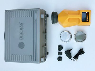 Trio.Bas* MINI Kit 100 liters/min^ Trio.Bas* MINI Kit, Contains: MINI Bluetooth, Contact Plate, with 100/240v battery charger and calibration certificate, Stainless steel aspirating head and cover to protect aspirating head, Light carrying case, Size: 100