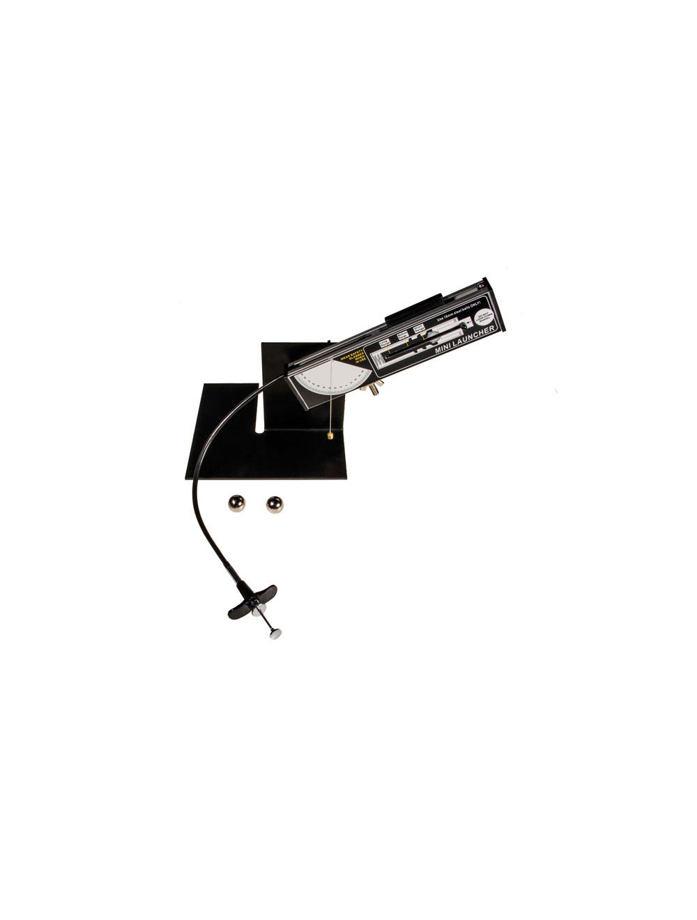 This simple but precise launcher projects 16 mm steel balls at ranges suitable for use on the bench top or from the bench to the floor. A protractor and plumb line make it easy to set any required launch angle from 45° downwards to straight up. Three different spring tensions give three repeatable launch speeds (ranges of 1m, 1.5m and 2m) and a magnetic piston ensures that the ball does not touch the side of the barrel and launches straight every time. A cable release gives a smooth triggering to prevent jerking. The unit can stand on its own or be fixed to the bench with a clamp.