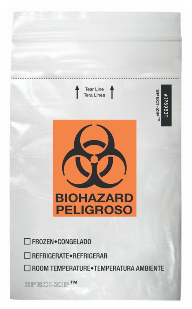 SPECI-ZIP Reclosable Clear Biohazard Bags with Black and Orange Biohazard Warning, Designed with temperature indicators and tear line, Case of 1000