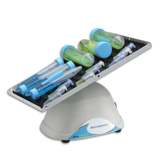 The MiniMixer™ 3-Dimensional Shaker provides the perfect 3-dimensional 'nutating', moderately aggressive motion allowing thorough, foam-free mixing in blood and centrifuge tubes. The MiniMixer™ was designed to provide more platform work space than traditional nutating mixers while conserving bench space with a 10.5 x 7.5 inch platform and a standard, autoclavable dimpled mat. This shaker also accepts a stackable platform and can handle loads up to 2kg. It features a maintenance-free, brushless motor and is safe for use in cold rooms and incubators. Speed: fixed at 24rpm (230V model: fixed at 20rpm). Tilt angle: /- 20°. Platform size: 27 x 19cm (10.5 x 7.5 inches). Load capacity: 2.0kg (4.4lb). Operating temperature range: 4°C to 65°C. Dimensions (W x D x H): 10.5 x 7.5 x 8 inches. Weight: 2.0kg (4.4lb). Electrical: 115V, 60Hz, 0.4A (Inquire for product in 230V, 50Hz, 0.2A). Warranty: 2 Years. Sold individually. Benchmark Scientific #: B3D1020.