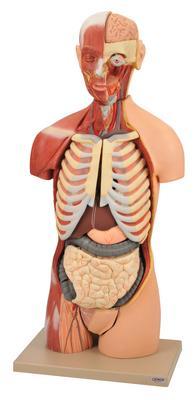 Model Torso with Muscles and Open Back-19 Parts^ Life size, 19 parts, half of brain, eye with muscles and optic nerve, 2-lung halves, heart in 2 parts, liver, stomach, small/large intestines, kidney, bladder with female pelvic floor and first lumbar vertebra.