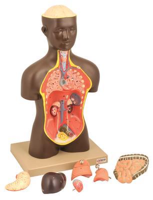 Model Torso half size with Head African-9 Parts^ Half size African torso, can be dissected into 9 parts. Half life-size can be quickly disassembled this torso, by removing lungs and heart-2 parts, stomach, liver and gall bladder, intestine 2 parts. Includes key card