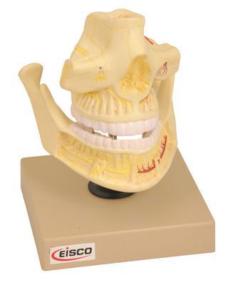 Model Adult Denture^ This model of adult upper and lower jaw shows tooth roots, spongiosa, vessels and nerves are exposed. The lower jaw is movable with the help of spring action.