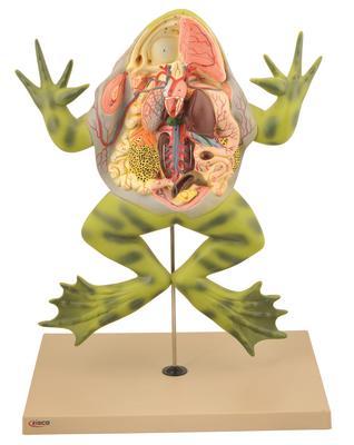 Model Frog with Open Back (Bull Frog)^ Model showing life like sculpting and vibrant hand painting faithfully portray ten organ systemsr, with numbered features. Molded of non breakable plastic base, bull frog lifts off its plastic stand for hands on study