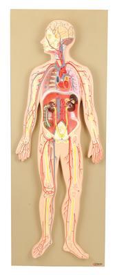 Model Human Circulatory System^ This half-size relief model helps in understand the circulation of blood in body through brain, heart, lung, liver, spleen, kidneys and partial skeleton. Mounted on base. Numbered with key card.