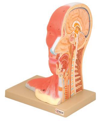 Model Human Head-Median Section^ Life size model showing the outer superficial muscles, vessels, nerves and head with muscles on one side. On the outer side details of median section such as brain, mouth, larynx are shown. Includes key card.