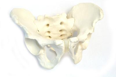 Model male pelvis^ It Illustrate the morphological distinctions between male and female pelvic structures. Each pelvis includes the left and right innominates with pubic symphysis, 4th and 5th lumbar vertebrae with intervertebral discs, the sacrum and coccyx.