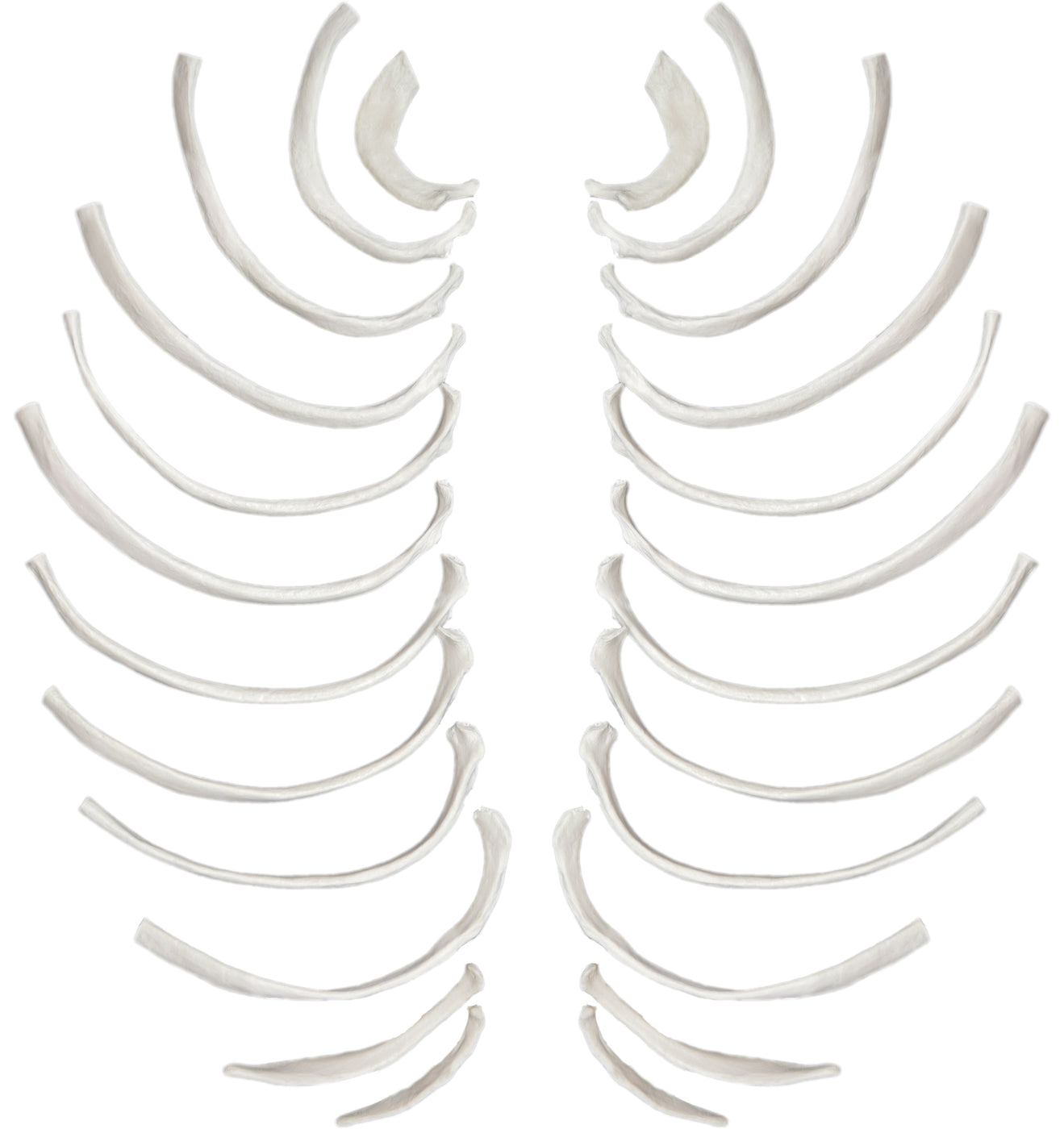Full set of disarticulated rib bones (24 pieces) Anatomically correct-model is natural size and natural color Realistic details & textures and bony landmarks make this model ideal for educational and medical demonstration Can be used for individual study or as replacement for missing or damaged pieces to a full skeletal model set Made of durable and sturdy PVC plastic. Washable. Full set of disarticulated model rib bones. These anatomically correct replica bones provide an incredible amount of realism and detail for examining the human skeleton. Features realistic textures and bony landmarks, making it an excellent tool for educational study, as well as for patient demonstrations.