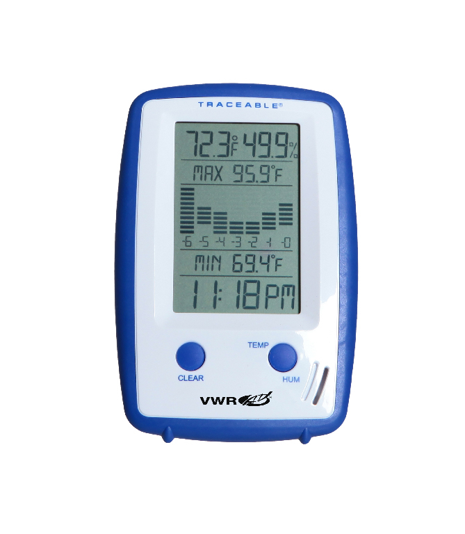Memory: 7 days, Temperature Range: –4...122 °F (–20...50 °C), Simultaneously display minimum and maximum and current temperature and humidity with seven day graph., This digital temperature and humidity meter continuously monitors and displays readings numerically and graphically. A week's worth of data is kept safe and the memory cannot be cleared, only overwritten by the next day's measurements. The internal sensor makes these ideal for use in hoods, stores, cleanrooms, incubators, and drying or environmental chambers., 04_BodyText: Traceable® products are calibrated to NIST-traceable standards and ready to use as soon as you receive it. Each product goes through an intense vetting process before it can carry the Traceable name, and it includes NIST-traceable certification. This means that a 17025 accredited calibration test lab has confirmed that the product meets or exceeds all stated specifications, saving you both time and money by not having to calibrate separately., 05_BodyText: NIST-traceable calibration also helps you meet quality standards and regulatory compliance for ISO, FDA, cGMP, VFC, CAP, CLIA and Joint Commission requirements., 02_BulletPoint: Get accurate, reliable measurements with included NIST traceable calibration | Scroll through temperature and humidity data for the past seven days | Maintain data integrity historical data cannot be cleared, only overwritten | Easily switch between °F/°C and 12/24 hour time formats | Benchtop or wall mount | Internal temperature probe | Digital indicator, 08_Certifications: CE and NIST-Traceable certificate with data., 11_Delivery: Includes flip-out stand, wall mount, double-sided tape mount, AAA battery., Monitoring thermo-hygrometer with calibration, Temperature Accuracy: ±0.4 °C, Humidity Range: 0 - 90 % RH, Humidity Resolution: 0.1% RH, Humidity Accuracy: ±4% RH (20 - 80% RH), ±5% RH elsewhere, Batteries: AAA battery (1), Display: 2.5"H LCD, Cat. No.: 76361-176, Final SAP Desc Link: 6819676, SAP Description Status: Ready, Simultaneously display minimum and maximum and current temperature and humidity with seven day graph., This digital temperature and humidity meter continuously monitors and displays readings numerically and graphically. A week's worth of data is kept safe and the memory cannot be cleared, only overwritten by the next day's measurements. The internal sensor makes these ideal for use in hoods, stores, cleanrooms, incubators, and drying or environmental chambers., 04_BodyText: Traceable® products are calibrated to NIST-traceable standards and ready to use as soon as you receive it. Each product goes through an intense vetting process before it can carry the Traceable name, and it includes NIST-traceable certification. This means that a 17025 accredited calibration test lab has confirmed that the product meets or exceeds all stated specifications, saving you both time and money by not having to calibrate separately., 05_BodyText: NIST-traceable calibration also helps you meet quality standards and regulatory compliance for ISO, FDA, cGMP, VFC, CAP, CLIA and Joint Commission requirements., 02_BulletPoint: Get accurate, reliable measurements with included NIST traceable calibration | Scroll through temperature and humidity data for the past seven days | Maintain data integrity historical data cannot be cleared, only overwritten | Easily switch between °F/°C and 12/24 hour time formats | Benchtop or wall mount | Internal temperature probe | Digital indicator, 08_Certifications: CE and NIST-Traceable certificate with data., 11_Delivery: Includes flip-out stand, wall mount, double-sided tape mount, AAA battery., Final SAP Desc Link: 6819676, SAP Description Status: Ready