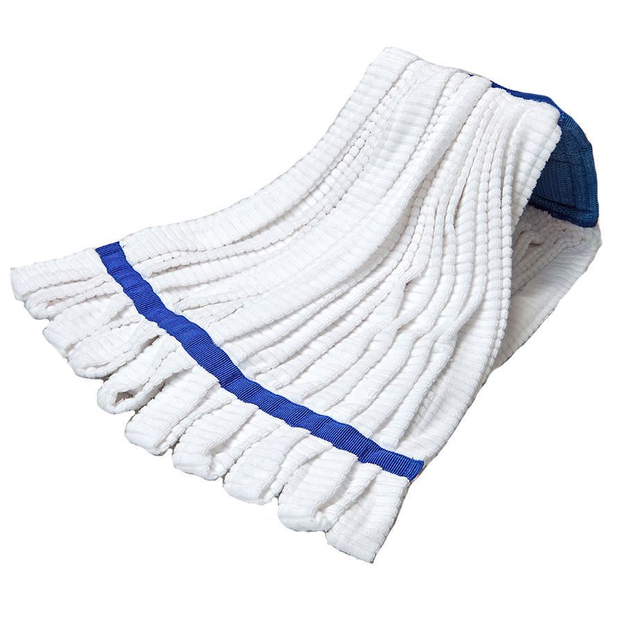 Mop Microfiber, 1Each^ Choice Microfiber White String Mop, Polyester And Nylon Blend With Blue Headband And Tailband, Can Be Relaundered And Re-Used, Lot Number Traceability, Microfiber Yarns Attract And Trap Dirt And Debris