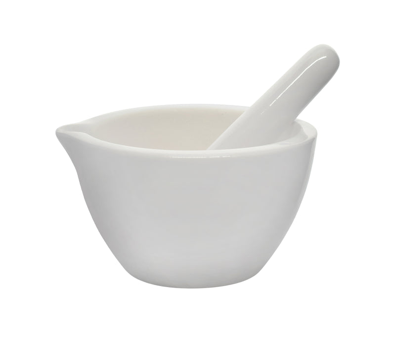 Features a flat bottom, unglazed grinding surfaces, and spout for easy pouring. Eisco™ Mortar and Pestle Set is made from lab quality porcelain and designed for efficient and uniform grinding of various materials.